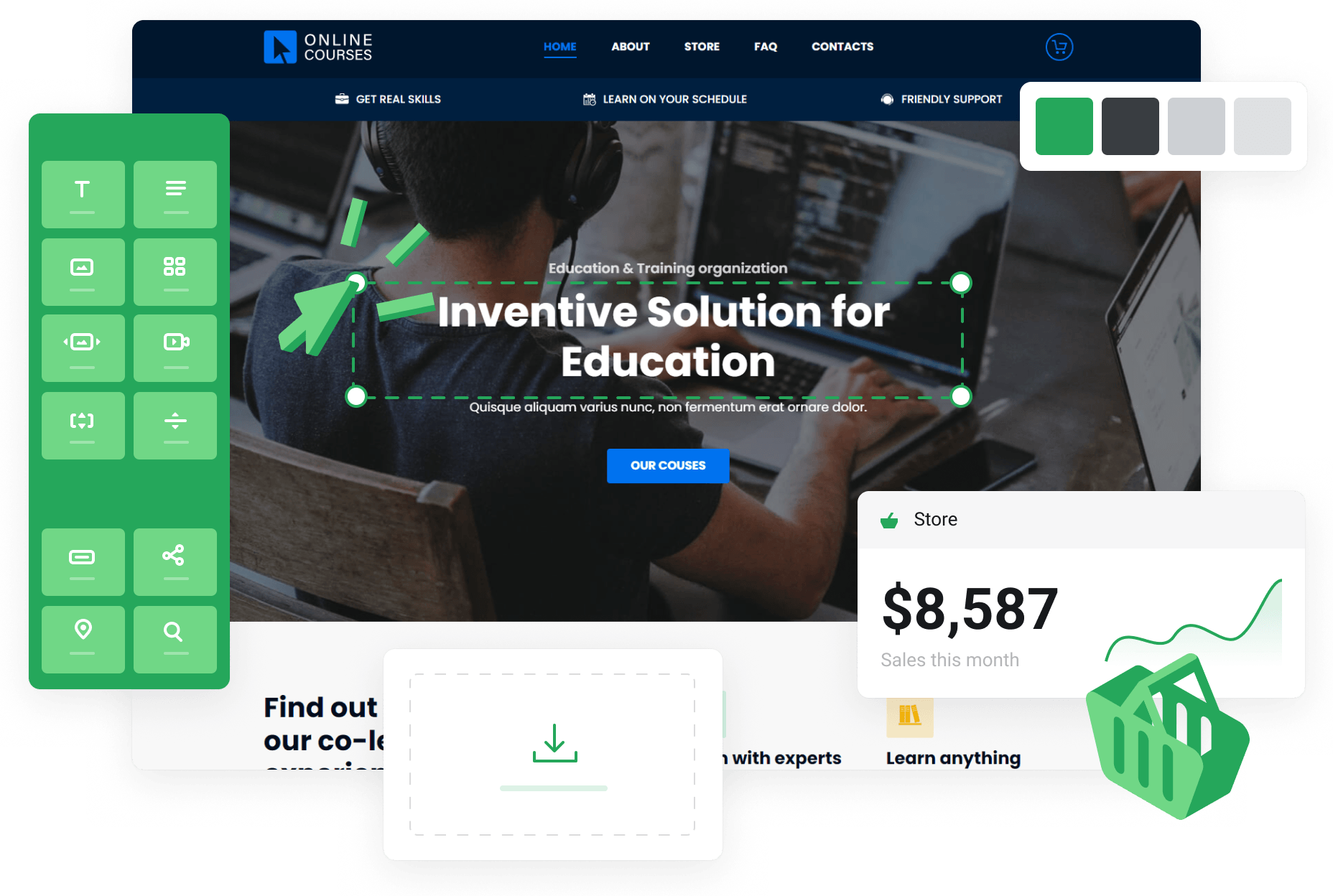 You can use ready-made layout elements like text, buttons, photos, or icons to build any custom professional website layout.
